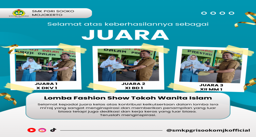 Dalam rangka memperingati Isra Mi'raj SMK PGRI Sooko Mojokerto mengadakan kegiatan lomba fashion show tokoh wanital islam. Diikuti sebanyak 19 peserta,acara berlangsung dengan lancar.